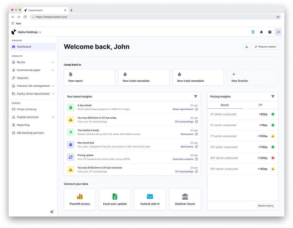 Transformed Interprice’s dashboard from a static overview into an action-driving tool. By surfacing key insights and guiding next steps, the redesign helped users make faster decisions, increased engagement across critical product areas, and strengthened confidence in a platform used by global banks.