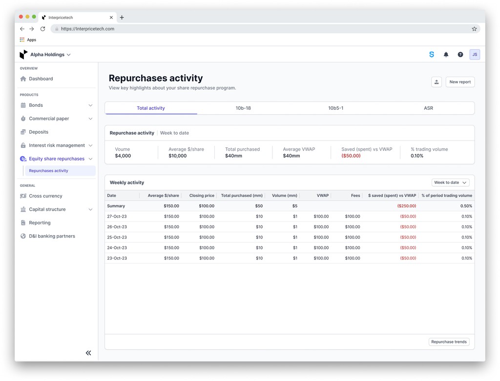 Designed and shipped a feature that streamlines the tracking, management, and reporting of repurchase programs for issuers on the Interprice platform. By providing real-time insights and customizable reporting, the feature replaced manual tracking, increasing efficiency and reducing errors. The interface offers simple, accessible views—total activity and individual program details—allowing users to quickly monitor and analyze repurchase activities, resulting in improved accuracy and time savings for issuers.