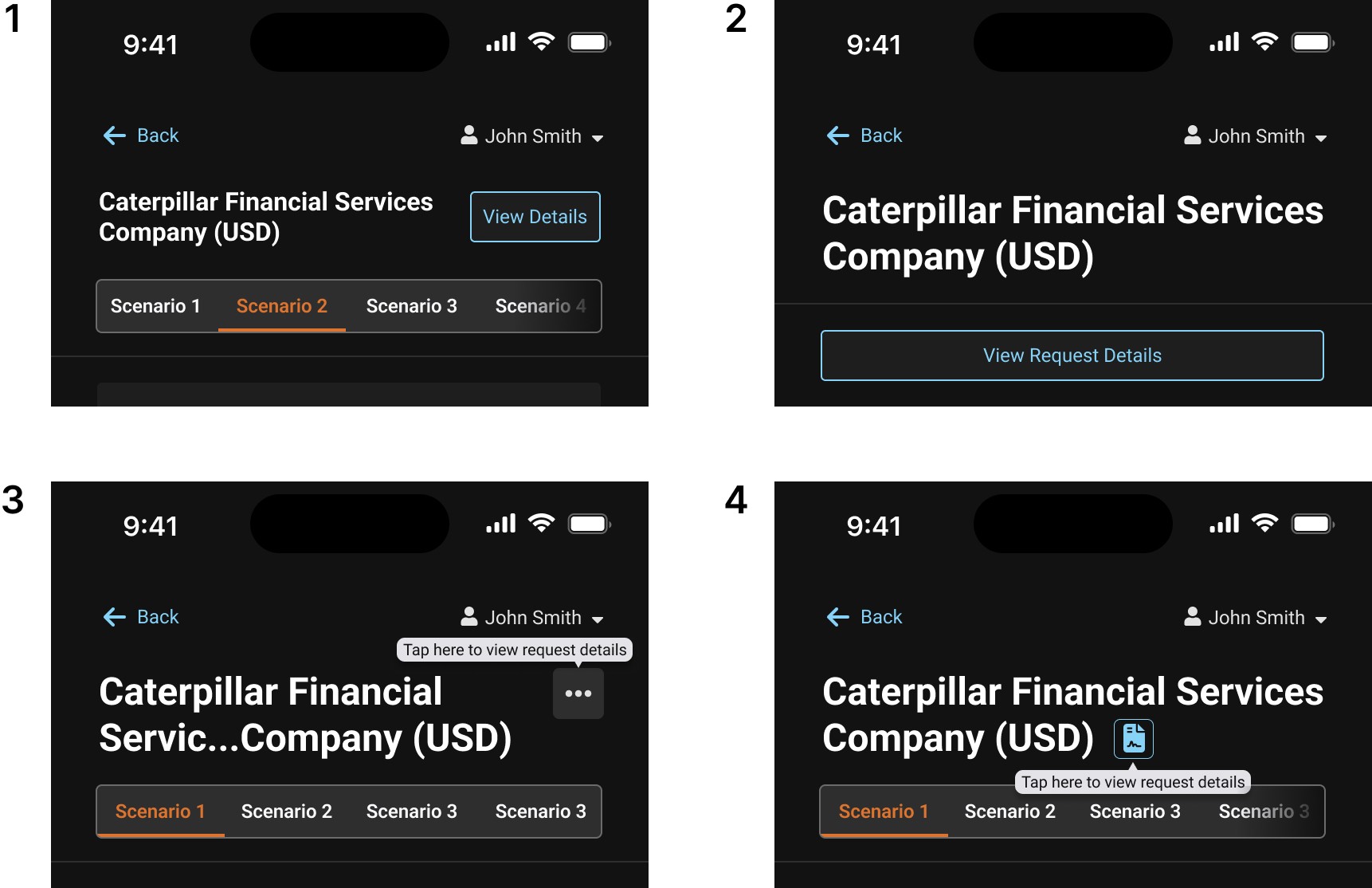 After thoroughly reviewing all four options with the product manager, we concluded that option 1 was the best design. This iteration title successfully communicated hierarchy without taking over the design. In addition, the "View Details" button would be in frequent use, making it impractical to hide it away as in options 3 and 4. We also recognized that dedicating an entire section for the title and button wasn't necessary and would potentially introduce further complications.